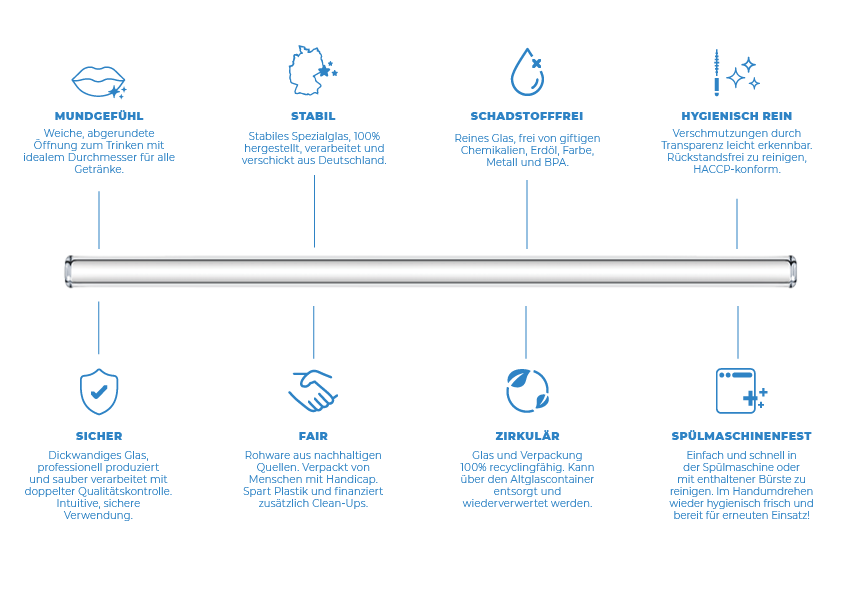 HALM 's glass straws stand for sustainability, Made in Germany, reusability, taste neutral and 100% plastic-free . HALM 's mission goes beyond the product and includes initiatives such as the "HALM Less Waste Initiative" to combat the flood of plastic and support cleanups worldwide. The glass straws are an overall concept of innovation, design, function and high ecological standards .