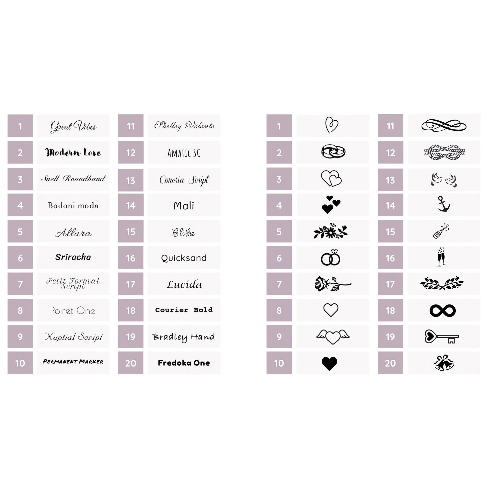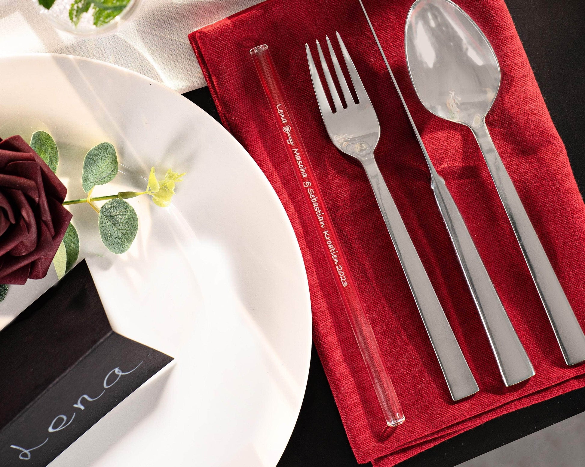 Choose from over 9600 combinations and make your glass straw absolutely unique. No matter whether you want to have the individual names of the guests, your names as a bride and groom or even special symbols, motifs and loving messages engraved - there are no limits !