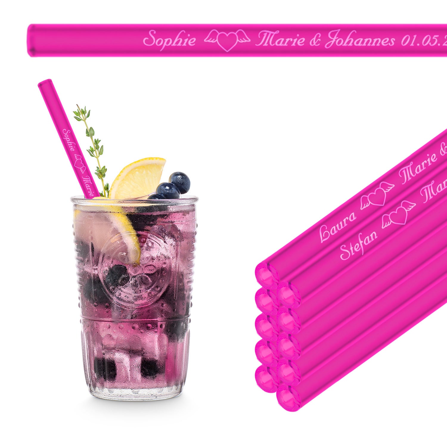 Adaptez votre commande à vos besoins – disponibles dès 10 pièces. Faites de votre événement un moment unique avec nos pailles en verre gravées Wedding-Straws !