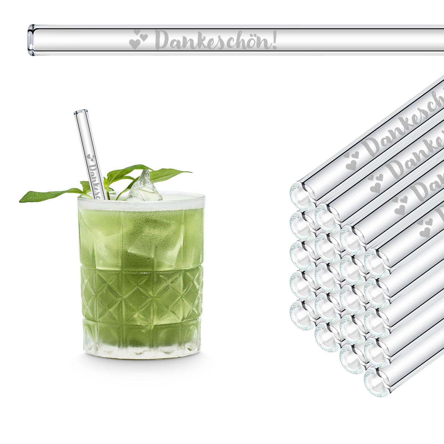 Mit einem schönen "Dankeschön" graviert auf nachhaltigen Glasstrohhalmen zeigst du deinen Gästen deine Wertschätzung und schenkst ihnen eine lebenslange Erinnerung an deine Hochzeit.